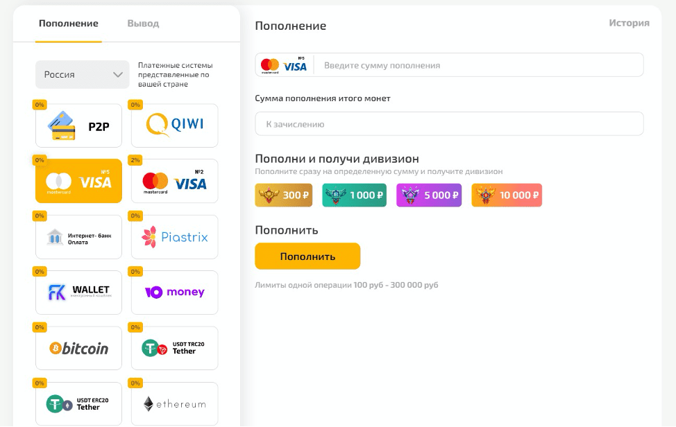| Карты | 100 ₽ | 300 000 ₽ | Не предусмотрена |